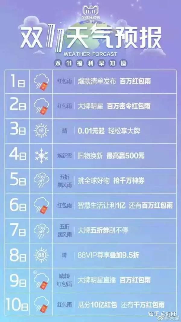 7、红包雨:红包雨可以说非常任性了,别人在淋雨,你可不能打伞呐。这个活动参与度可以说是全民参与啦,咱先来看看去年双十一的天气预报▼