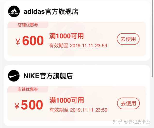比如NIke1000-500的券和阿迪券,可与双十一折扣叠加使用!
