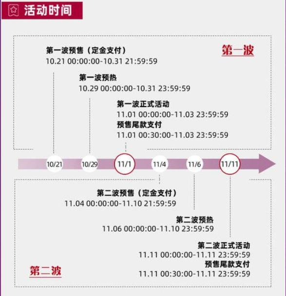 首先今年的双十一和往年一样也是以付定金预售,定金抵现以及现货售卖的形式进行。不同的是今年有两波售卖期,即11月1—3日开始第一波付尾款售卖,11月11日—14日开启第二波尾款支付。